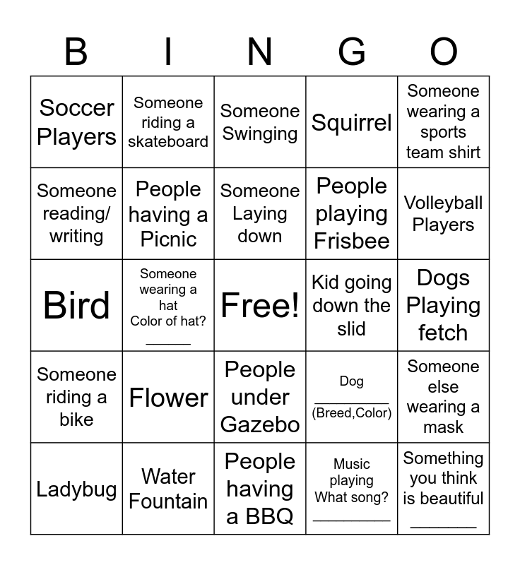 This bingo card has a free space and 27 words: Dog __________ (Breed,Color), Someone hugging a tree, People playing Frisbee, People having a BBQ, Someone reading/ writing, Someone Swinging, Someone riding a skateboard, Someone riding a bike, Kid going down the slid, Someone else wearing a mask, Bird, Squirrel, Ladybug, Water Fountain, Volleyball Players, Tennis Players, People having a Picnic, Someone Laying down, Flower, Soccer Players, Dogs Playing fetch, Music playing What song? __________, Someone wearing a hat Color of hat? ______, Something you think is beautiful _______, People under Gazebo, Someone wearing a sports team shirt and People playing Football.