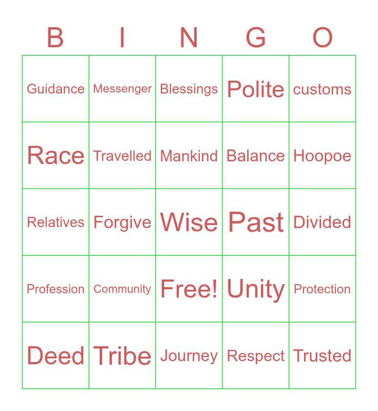 This bingo card has 26 words: Free!, Respect, Mankind, Tribe, customs, Guidance, Race, Messenger, Divided, Unity, Balance, Relatives, Protection, Deed, Forgive, Elders, Polite, Profession, Blessings, Wise, Hoopoe, Journey, Past, Community, Travelled and Trusted.