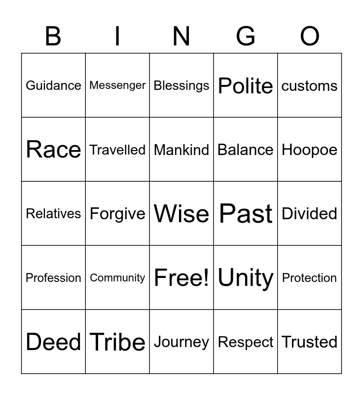 This bingo card has 26 words: Free!, Respect, Mankind, Tribe, customs, Guidance, Race, Messenger, Divided, Unity, Balance, Relatives, Protection, Deed, Forgive, Elders, Polite, Profession, Blessings, Wise, Hoopoe, Journey, Past, Community, Travelled and Trusted.