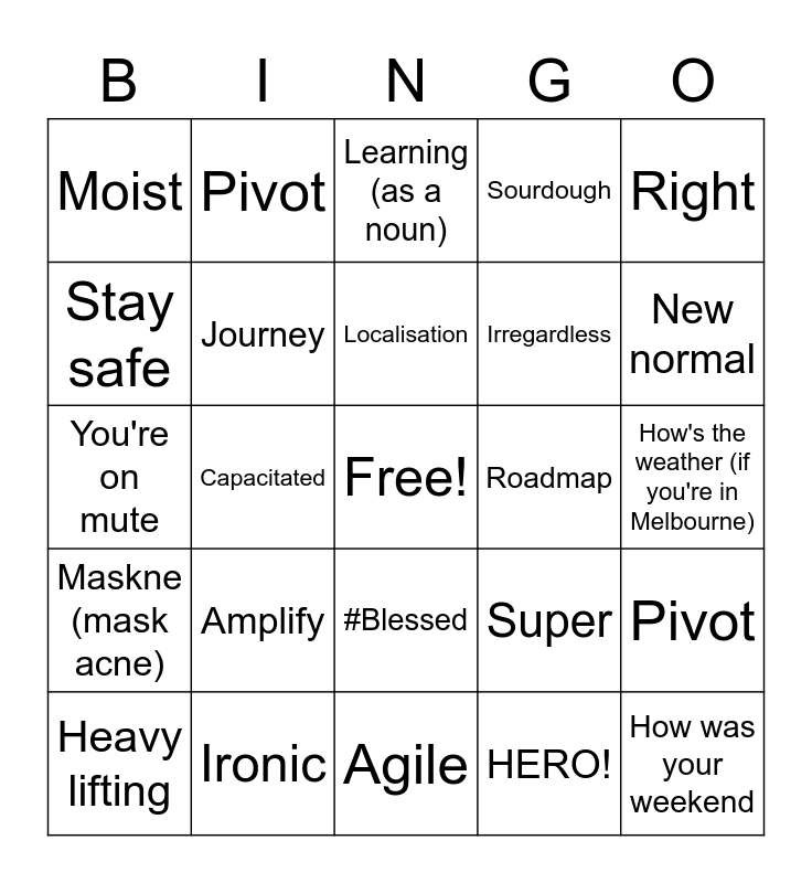 This bingo card has a free space and 37 words: Unprecedented, Coordination, Harmonised, Journey, Pivot, Amplify, Localisation, Covfefe, Right, Wrong, Capacitated, Sourdough, How was your weekend, How's the weather (if you're in Melbourne), Stay safe, Maskne (mask acne), Any word hybrids or portmanteaus, Learning (as a noun), #Blessed, Roadmap, Moist, New normal, Heavy lifting, Agile, Lean, HERO!, Pivot, Agile, Leverage, Synergy, Apologies for cross posting, Ironic, You're on mute, Unpack, Super, Irregardless and COVID 19.