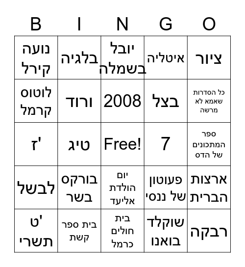This bingo card has a free space and 29 words: ט' תשרי, האזינו, טיג, סאני, נועה קירל, יובל בשמלה, ורוד, בורקס בשר, 7, בית ספר קשת, ספר המתכונים של הדס, רבקה, בית חולים כרמל, שוקלד בואנו, כל הסדרות שאמא לא מרשה, Lego friends, יום הולדת אליעד, לבשל, ציור, ז', פעוטון של ננסי, ננסי, בצל, לוטוס קרמל, איטליה, בלגיה, ארצות הברית, 2008 and 7 אוקטובר.