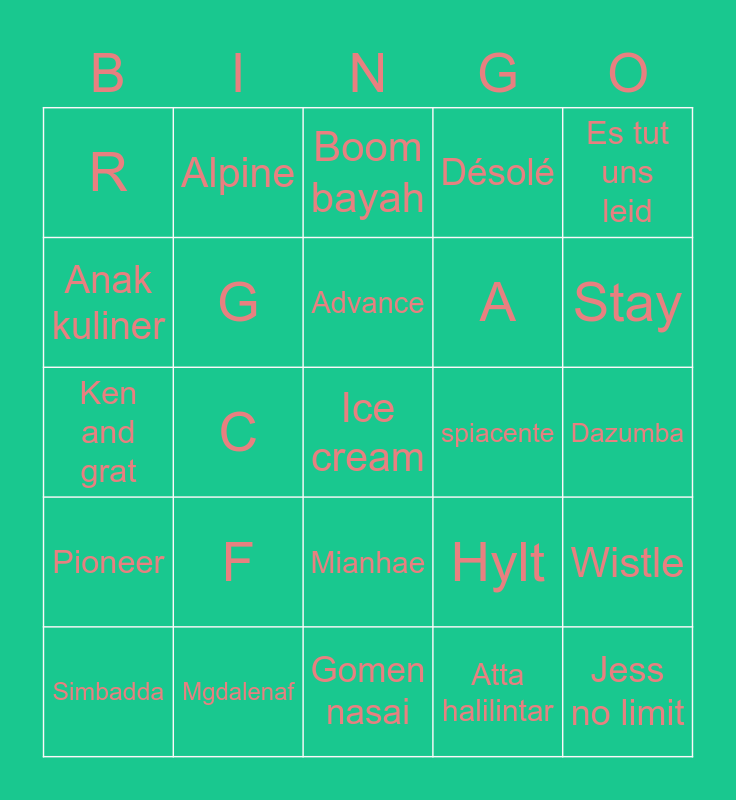 This bingo card has a free space and 24 words: F, Mgdalenaf, Advance, Simbadda, Es tut uns leid, R, Anak kuliner, Alpine, spiacente, Mianhae, A, Ken and grat, Hylt, Wistle, G, Atta halilintar, Dazumba, Boom bayah, Stay, C, Jess no limit, Pioneer, Désolé and Gomen nasai.
