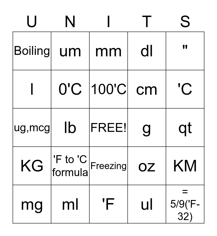 This bingo card has a free space and 28 words: KM, m, cm, ul, l, mm, um, KG, g, mg, ug,mcg, dl, ml, 'F, 'C, 'C to 'F formula, 'F to 'C formula, 0'C, 100'C, Freezing, Boiling, = 9/5 x 'C+32, = 5/9('F-32), lb, qt, oz, " and '.