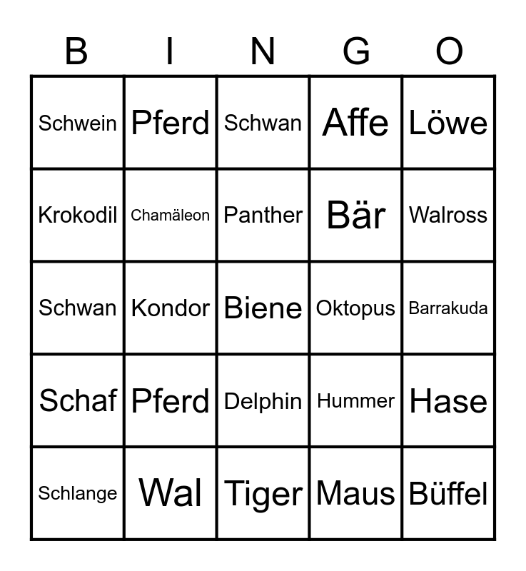 This bingo card has 50 words: Amsel (Vogel), Biene, Elefant, Tiger, Pferd, Huhn, Pferd, Wolf, Krokodil, Hund, Chamäleon, Affe, Hase, Hummer, Löwe, Katze, Panther, Oktopus, Fisch, Löwe, Kondor, Maus, Schwein, Bär, Rentier, Büffel, Walross, Fuchs, Schwan, Delphin, Frosch, Pferd, Affe, Fledermaus, Wal, Käfer, Küchenschabe, Katze, Drache, Barrakuda, Fuchs, Wolf, Taube, Bär, Schlange, Schwan, Schwein, Katze, Schaf and Hummel.