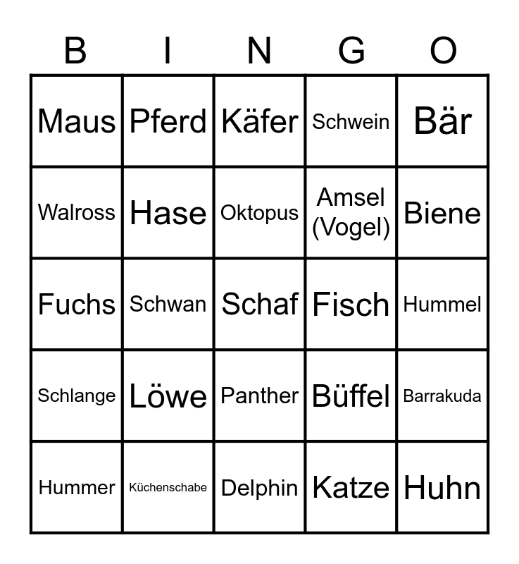 This bingo card has 39 words: Hund, Chamäleon, Affe, Hase, Hummer, Panther, Oktopus, Taube, Bär, Schlange, Schwan, Schwein, Schaf, Hummel, Fisch, Löwe, Kondor, Maus, Rentier, Büffel, Walross, Delphin, Amsel (Vogel), Biene, Elefant, Tiger, Huhn, Krokodil, Frosch, Pferd, Fledermaus, Wal, Käfer, Küchenschabe, Katze, Drache, Barrakuda, Fuchs and Wolf.