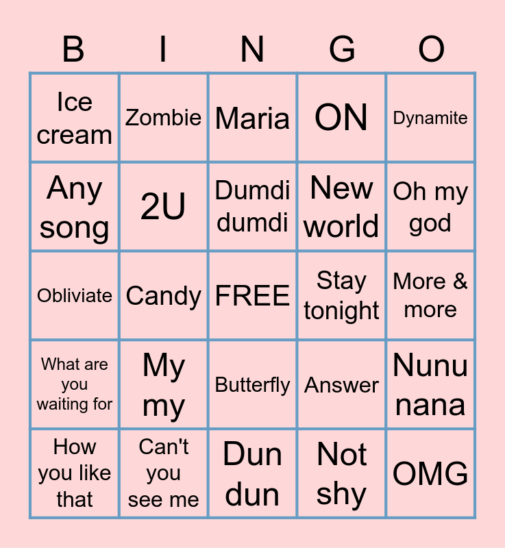 This bingo card has a free space and 24 words: How you like that, My my, Dumdi dumdi, Not shy, Dynamite, Ice cream, Zombie, Maria, Stay tonight, More & more, Obliviate, 2U, Answer, Nunu nana, Any song, Can't you see me, Dun dun, ON, Oh my god, What are you waiting for, Candy, Butterfly, New world and OMG.
