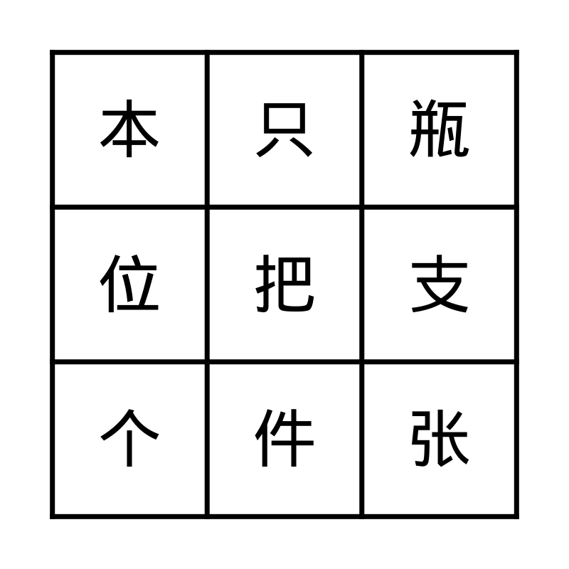 This bingo card has 9 words: 个, 把, 瓶, 本, 只, 支, 位, 件 and 张.