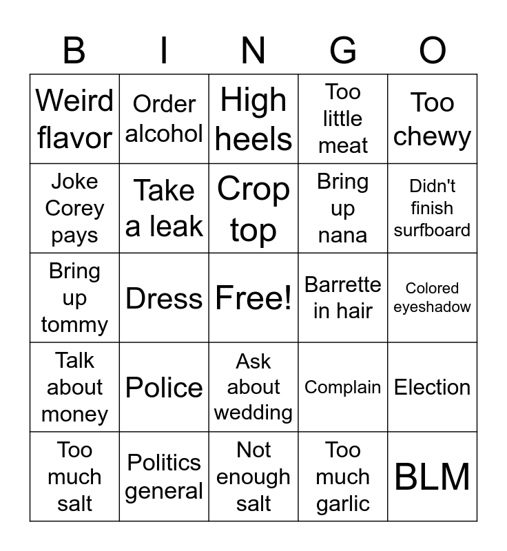 This bingo card has a free space and 24 words: Too much salt, Police, Crop top, Too much garlic, Too chewy, Weird flavor, Order alcohol, High heels, Barrette in hair, Colored eyeshadow, Bring up tommy, Take a leak, Complain, Election, Joke Corey pays, Politics general, Not enough salt, Too little meat, Didn't finish surfboard, Talk about money, Dress, Ask about wedding, Bring up nana and BLM.