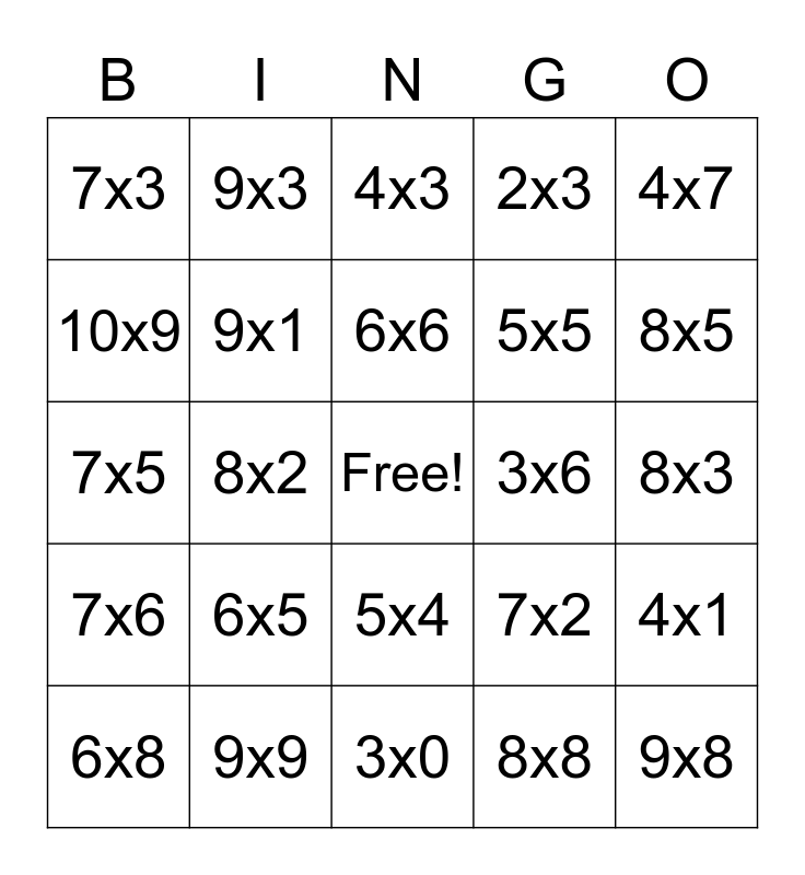 This bingo card has a free space and 34 words: 4x2, 8x8, 9x5, 8x4, 7x6, 9x1, 4x7, 6x8, 9x3, 5x3, 6x6, 4x3, 5x1, 7x9, 3x6, 8x5, 9x9, 7x5, 6x5, 7x2, 5x4, 9x6, 7x3, 8x3, 3x0, 9x8, 2x3, 8x7, 5x5, 10x9, 7x7, 8x2, 4x1 and 5x2.