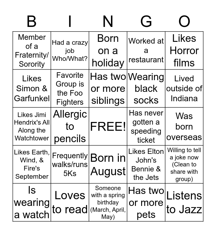This bingo card has a free space and 24 words: Frequently walks/runs 5Ks, Loves to read, Has two or more siblings, Is wearing a watch, Likes Horror films, Member of a Fraternity/ Sorority, Likes Simon & Garfunkel, Had a crazy job Who/What?, Has never gotten a speeding ticket, Born in August, Wearing black socks, Likes Jimi Hendrix's All Along the Watchtower, Likes Elton John's Bennie & the Jets, Willing to tell a joke now (Clean to share with group), Favorite Group is the Foo Fighters, Has two or more pets, Was born overseas, Born on a holiday, Lived outside of Indiana, Allergic to pencils, Listens to Jazz, Likes Earth, Wind, & Fire's September, Worked at a restaurant and Someone with a spring birthday (March, April, May).