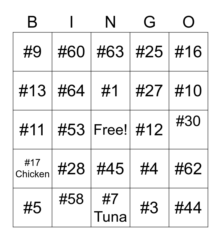This bingo card has a free space and 24 words: #28, #58, #1, #5, #16, #9, #13, #60, #12, #45, #27, #11, #4, #62, #64, #3, #30, #63, #10, #53, #44, #17 Chicken, #25 and #7 Tuna.