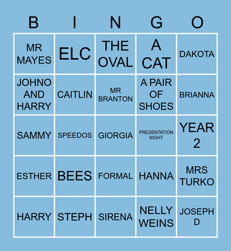 This bingo card has 25 words: BEES, SIRENA, MR BRANTON, HARRY, DAKOTA, MR MAYES, JOHNO AND HARRY, ELC, PRESENTATION NIGHT, FORMAL, A PAIR OF SHOES, SAMMY, HANNA, MRS TURKO, CAITLIN, JOSEPH D, YEAR 2, THE OVAL, BRIANNA, SPEEDOS, GIORGIA, STEPH, ESTHER, A CAT and NELLY WEINS.