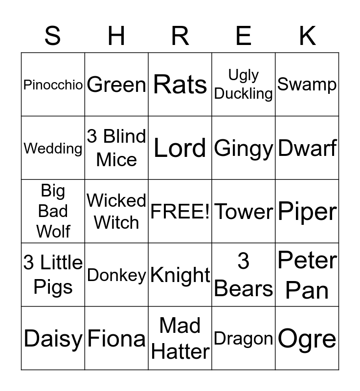 This bingo card has a free space and 24 words: Donkey, Fiona, Lord, Daisy, Swamp, Pinocchio, Wedding, Green, Tower, Knight, Gingy, Big Bad Wolf, 3 Bears, Peter Pan, 3 Blind Mice, Dragon, Piper, Rats, Dwarf, Wicked Witch, Ogre, 3 Little Pigs, Ugly Duckling and Mad Hatter.