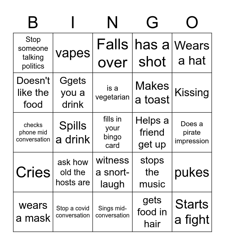 This bingo card has a free space and 29 words: wears a mask, Sings Happy Birthday, Spills a drink, Photo bombs a selfie, Stop someone talking politics, Falls over, Ggets you a drink, ask how old the hosts are, Helps a friend get up, Stop a covid conversation, Does a pirate impression, Starts a fight, Sings mid-conversation, gets food in hair, Kissing, Gives a high5, witness a snort-laugh, Cries, Wears a hat, checks phone mid conversation, stops the music, Gives life advise, Makes a toast, Doesn't like the food, has a shot, vapes, pukes, is a vegetarian and Brings a gift.