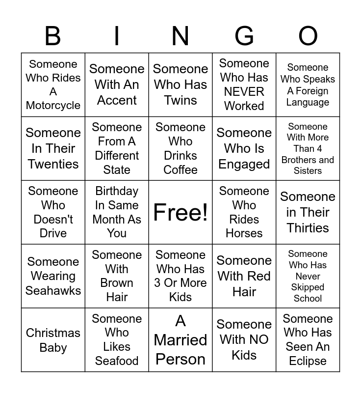 This bingo card has a free space and 24 words: Someone With Brown Hair, Someone Who Likes Seafood, Someone Who Drinks Coffee, Christmas Baby, Someone Who Speaks A Foreign Language, Someone Who Rides A Motorcycle, Someone In Their Twenties, Someone With An Accent, Someone Who Rides Horses, Someone Who Has 3 Or More Kids, Someone Who Is Engaged, Someone Who Doesn't Drive, Someone With Red Hair, Someone Who Has Never Skipped School, Someone From A Different State, Someone With NO Kids, Someone in Their Thirties, Someone Who Has Twins, Someone With More Than 4 Brothers and Sisters, Birthday In Same Month As You, Someone Who Has Seen An Eclipse, Someone Wearing Seahawks, Someone Who Has NEVER Worked and A Married Person.