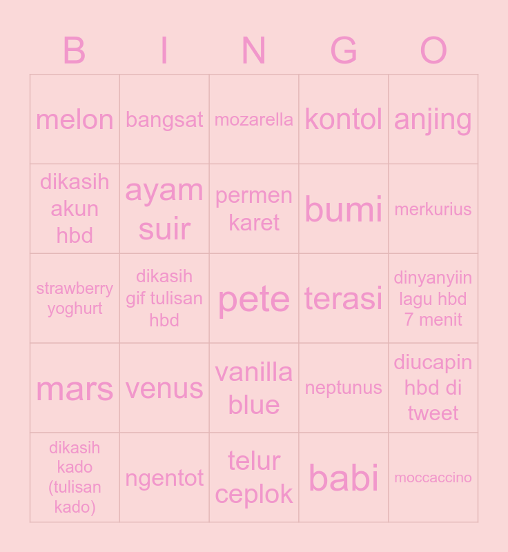 This bingo card has a free space and 24 words: venus, ngentot, permen karet, dikasih kado (tulisan kado), anjing, melon, dikasih akun hbd, bangsat, terasi, vanilla blue, bumi, strawberry yoghurt, neptunus, diucapin hbd di tweet, ayam suir, babi, dinyanyiin lagu hbd 7 menit, mozarella, merkurius, dikasih gif tulisan hbd, moccaccino, mars, kontol and telur ceplok.