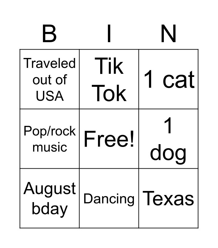 This bingo card has a free space and 8 words: 1 dog, 1 cat, Tik Tok, August bday, Traveled out of USA, Texas, Pop/rock music and Dancing.
