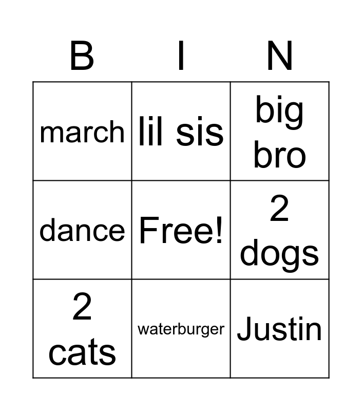 This bingo card has a free space and 8 words: 2 dogs, big bro, lil sis, 2 cats, march, Justin, dance and waterburger.
