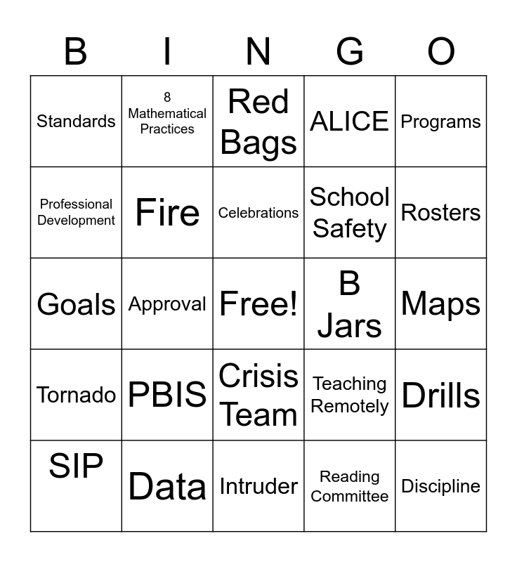 This bingo card has a free space and 24 words: PBIS, Data, Celebrations, SIP, Programs, Standards, Professional Development, 8 Mathematical Practices, B Jars, Crisis Team, School Safety, Goals, Teaching Remotely, Drills, Fire, Reading Committee, Maps, Red Bags, Rosters, Approval, Discipline, Tornado, ALICE and Intruder.