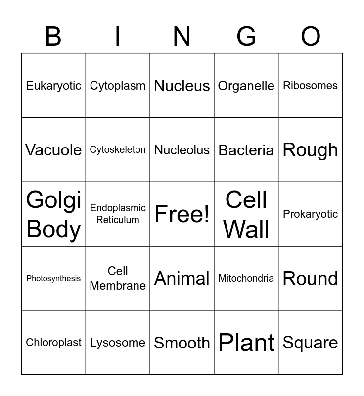 This bingo card has a free space and 24 words: Cell Membrane, Lysosome, Nucleolus, Chloroplast, Ribosomes, Eukaryotic, Vacuole, Cytoplasm, Cell Wall, Animal, Bacteria, Golgi Body, Mitochondria, Round, Cytoskeleton, Plant, Prokaryotic, Nucleus, Rough, Endoplasmic Reticulum, Square, Photosynthesis, Organelle and Smooth.