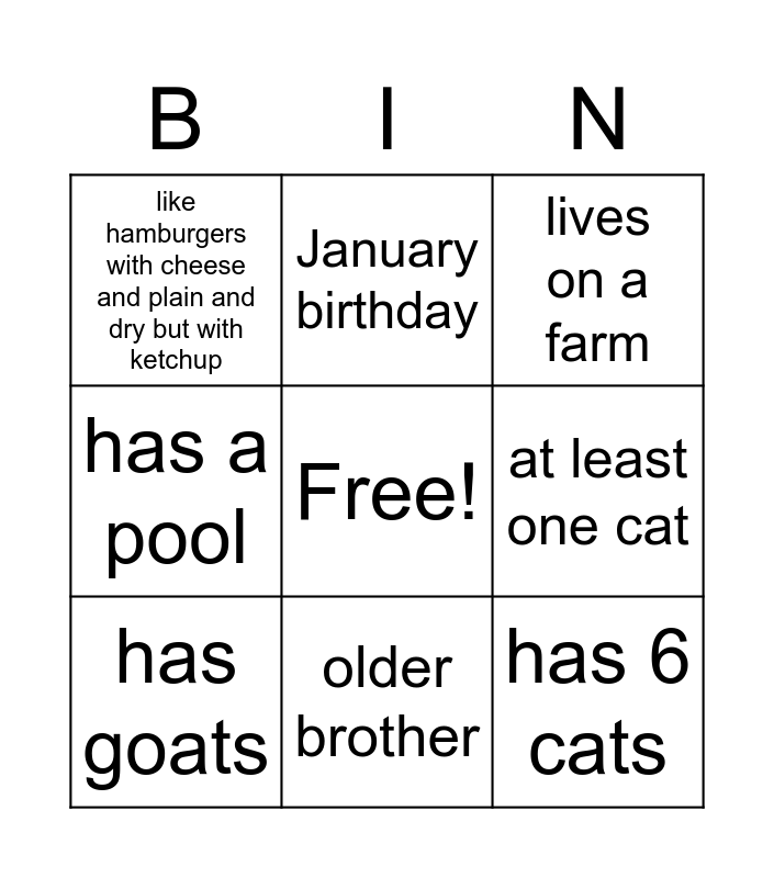 This bingo card has a free space and 8 words: at least one cat, lives on a farm, January birthday, has goats, like hamburgers with cheese and plain and dry but with ketchup, has 6 cats, has a pool and older brother.