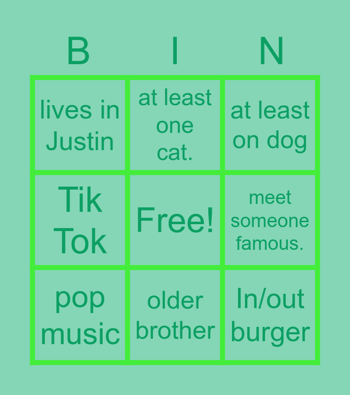 This bingo card has a free space and 8 words: meet someone famous., at least on dog, at least one cat., pop music, lives in Justin, In/out burger, Tik Tok and older brother.