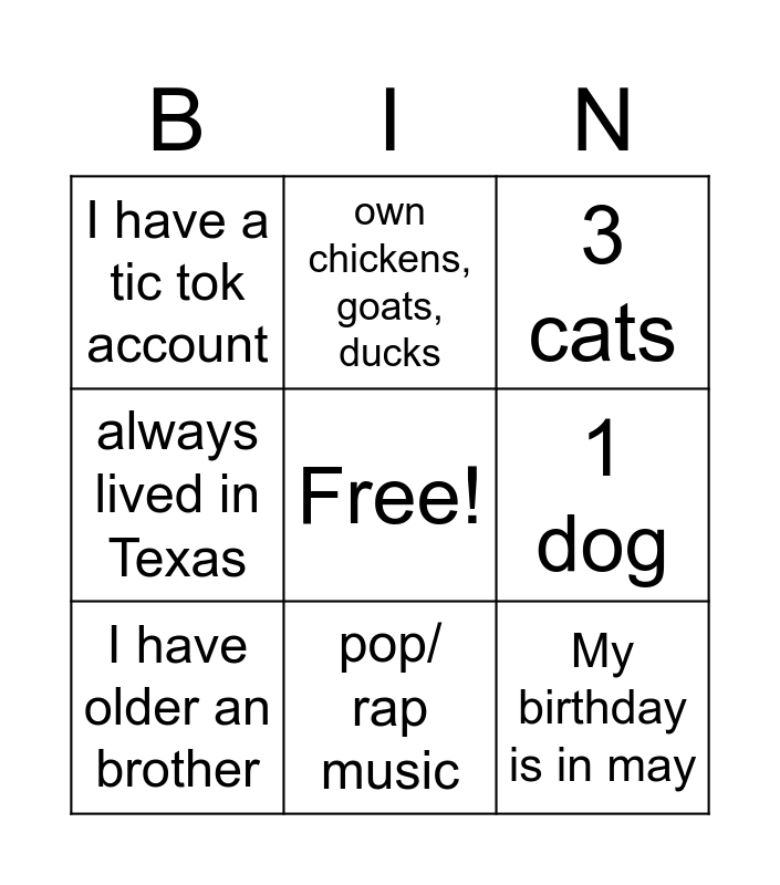 This bingo card has a free space and 8 words: 1 dog, 3 cats, own chickens, goats, ducks, I have older an brother, I have a tic tok account, My birthday is in may, always lived in Texas and pop/ rap music.