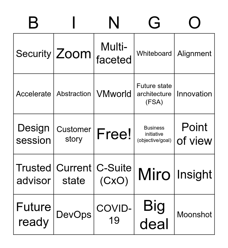 This bingo card has a free space and 29 words: Future ready, Bold, Customer story, Solution selling, Security, Multi-faceted, Abstraction, Current state, Business initiative (objective/goal), DevOps, Point of view, Moonshot, COVID-19, Big deal, Innovation, BVS (BSS/FA), C-Suite (CxO), Trusted advisor, Alignment, Design session, Miro, Business value hypothesis (BVH), Future state architecture (FSA), Accelerate, Whiteboard, Zoom, Insight, VMworld and Work from home.