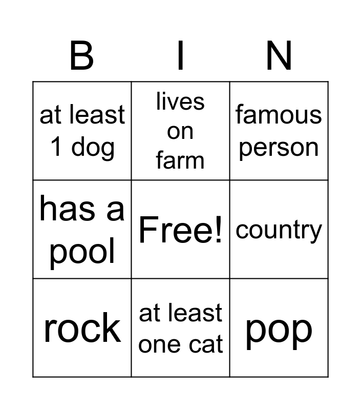 This bingo card has a free space and 8 words: country, famous person, lives on farm, rock, at least 1 dog, pop, has a pool and at least one cat.