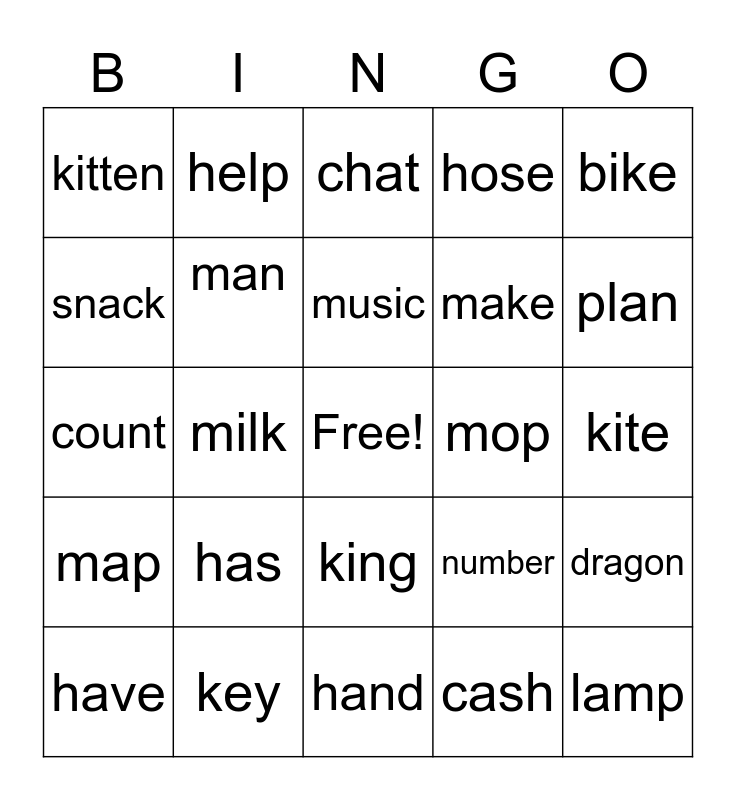 This bingo card has a free space and 24 words: has, key, music, have, bike, kitten, snack, help, mop, king, make, count, number, dragon, man, cash, kite, chat, plan, milk, lamp, map, hose and hand.