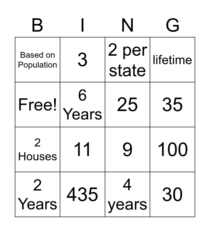 This bingo card has 16 words: 435, 100, 2 per state, Based on Population, 2 Houses, 3, 9, 4 years, Free!, 6 Years, 2 Years, lifetime, 11, 35, 25 and 30.