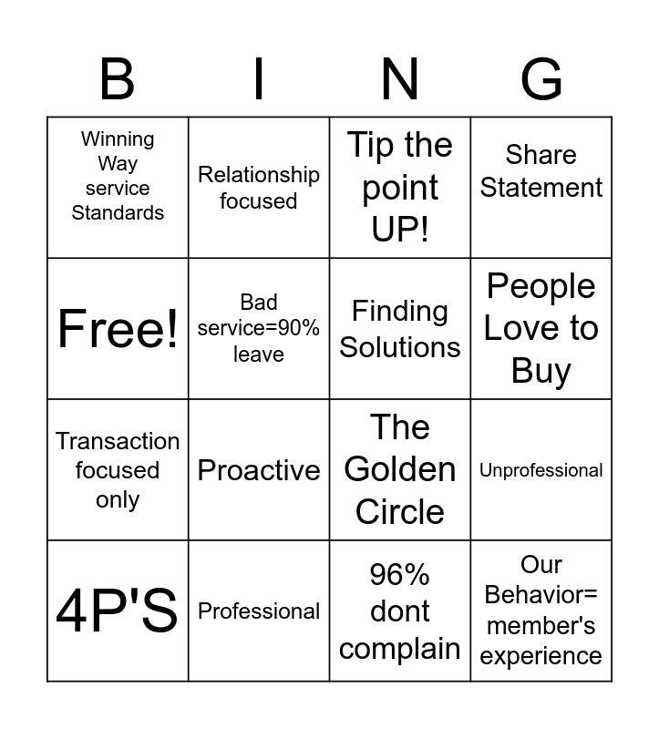 This bingo card has 16 words: Professional, Unprofessional, Tip the point UP!, Winning Way service Standards, Transaction focused only, Relationship focused, The Golden Circle, 96% dont complain, Free!, Bad service=90% leave, 4P'S, Share Statement, Proactive, People Love to Buy, Finding Solutions and Our Behavior= member's experience.
