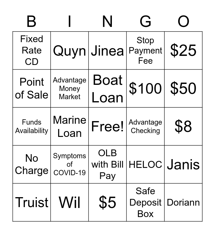 This bingo card has a free space and 24 words: Symptoms of COVID-19, Wil, Boat Loan, Truist, $25, Fixed Rate CD, Point of Sale, Quyn, Advantage Checking, OLB with Bill Pay, $100, Funds Availability, HELOC, Janis, Advantage Money Market, Safe Deposit Box, $8, Jinea, $50, Marine Loan, Doriann, No Charge, Stop Payment Fee and $5.