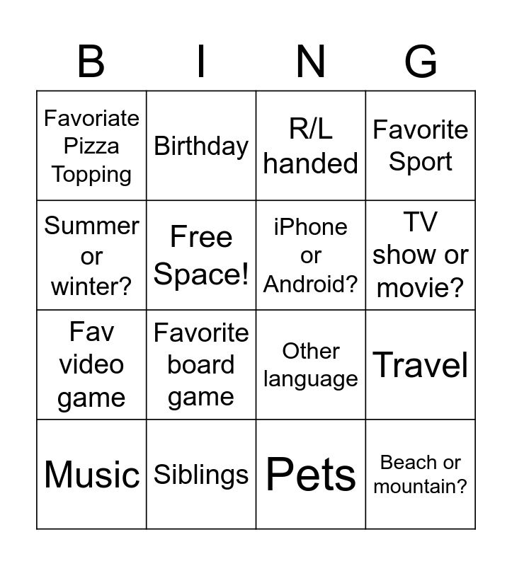 This bingo card has 16 words: Siblings, Travel, R/L handed, Favoriate Pizza Topping, Fav video game, Birthday, Other language, Pets, Summer or winter?, Free Space!, Music, Favorite Sport, Favorite board game, TV show or movie?, iPhone or Android? and Beach or mountain?.