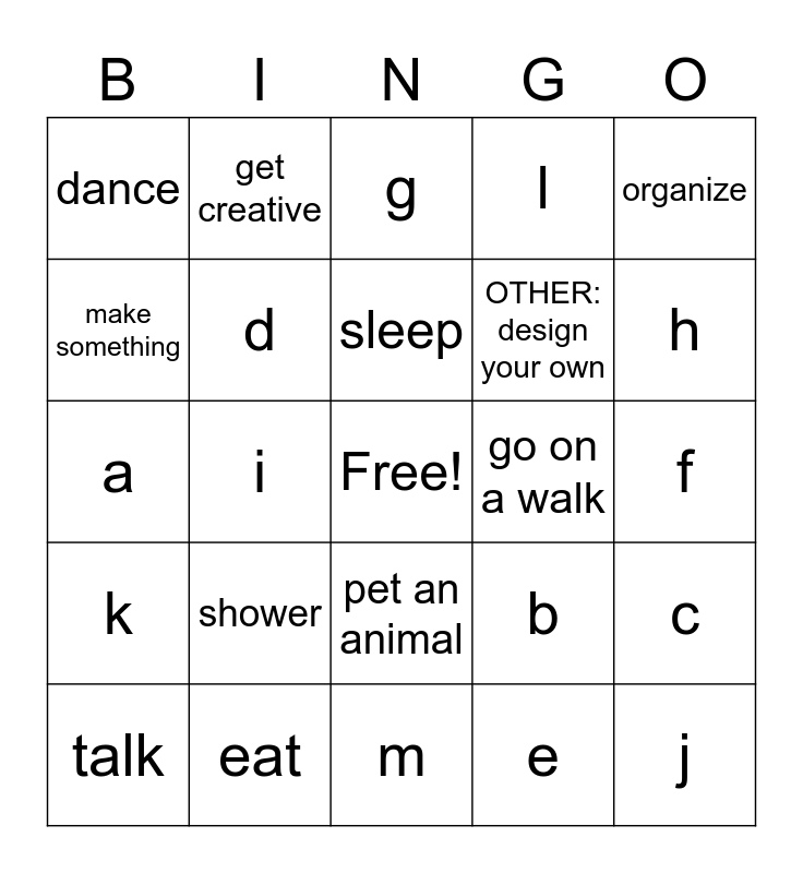 This bingo card has a free space and 24 words: shower, eat, sleep, talk, organize, dance, make something, get creative, go on a walk, pet an animal, OTHER: design your own, a, b, c, d, e, f, g, h, i, j, k, l and m.