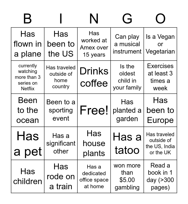 This bingo card has a free space and 24 words: Has a significant other, Has rode on a train, Drinks coffee, Has children, Is a Vegan or Vegetarian, Has flown in a plane, currently watching more than 3 series on Netflix, Has been to the US, Has planted a garden, Has house plants, Is the oldest child in your family, Been to the ocean, Has a tatoo, Has traveled outside of the US, India or the UK, Has traveled outside of home country, won more than $5.00 gambling, Has been to Europe, Has worked at Amex over 15 years, Exercises at least 3 times a week, Been to a sporting event, Read a book in 1 day (>300 pages), Has a pet, Can play a musical instrument and Has a dedicated office space at home.