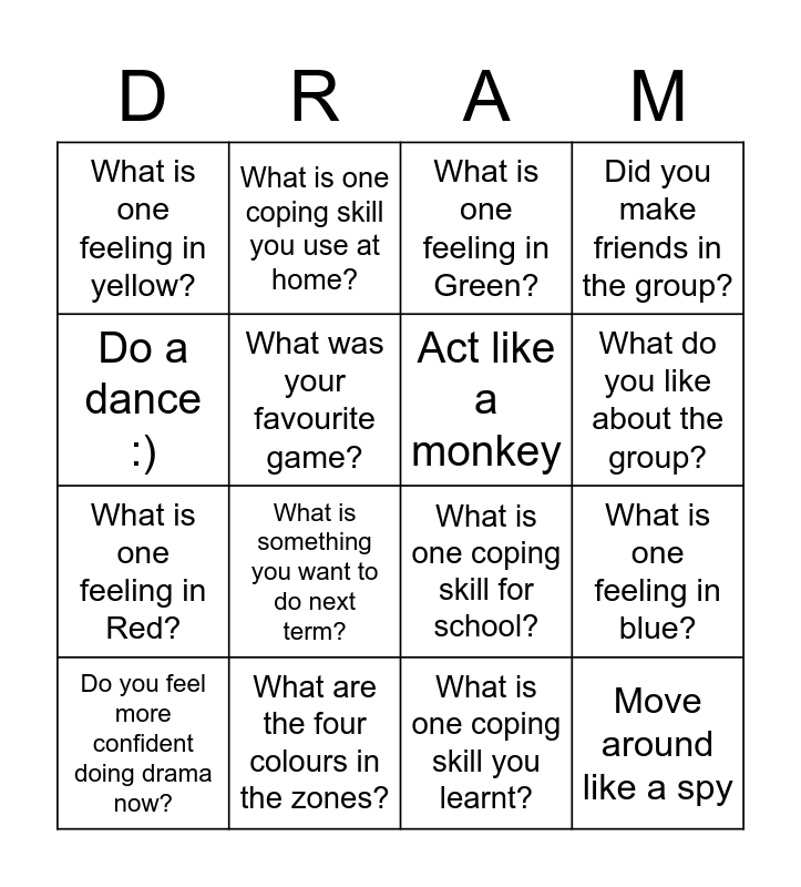This bingo card has 16 words: What are the four colours in the zones?, What is one feeling in blue?, What is one feeling in Green?, What is one feeling in yellow?, What is one feeling in Red?, What is one coping skill you use at home?, What is one coping skill for school?, What is one coping skill you learnt?, Do a dance :), What was your favourite game?, Do you feel more confident doing drama now?, Did you make friends in the group?, What is something you want to do next term?, What do you like about the group?, Act like a monkey and Move around like a spy.