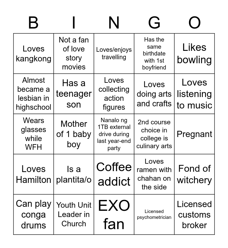This bingo card has 25 words: Is a plantita/o, EXO fan, Loves collecting action figures, Can play conga drums, Likes bowling, Loves kangkong, Almost became a lesbian in highschool, Not a fan of love story movies, 2nd course choice in college is culinary arts, Coffee addict, Loves doing arts and crafts, Wears glasses while WFH, Loves ramen with chahan on the side, Fond of witchery, Has a teenager son, Licensed customs broker, Pregnant, Loves/enjoys travelling, Loves listening to music, Mother of 1 baby boy, Nanalo ng 1TB external drive during last year-end party, Youth Unit Leader in Church, Loves Hamilton, Has the same birthdate with 1st boyfriend and Licensed psychometrician.