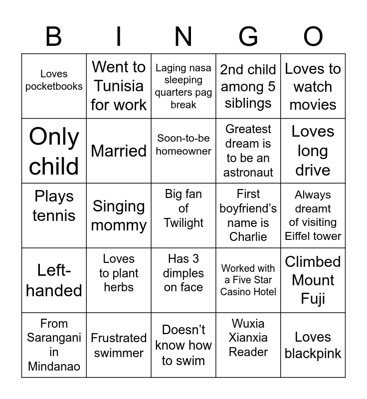 This bingo card has 25 words: Loves to plant herbs, Doesn’t know how to swim, Soon-to-be homeowner, From Sarangani in Mindanao, Loves to watch movies, Loves pocketbooks, Only child, Went to Tunisia for work, First boyfriend’s name is Charlie, Has 3 dimples on face, Greatest dream is to be an astronaut, Plays tennis, Worked with a Five Star Casino Hotel, Climbed Mount Fuji, Married, Loves blackpink, Always dreamt of visiting Eiffel tower, Laging nasa sleeping quarters pag break, Loves long drive, Singing mommy, Big fan of Twilight, Frustrated swimmer, Left-handed, 2nd child among 5 siblings and Wuxia Xianxia Reader.