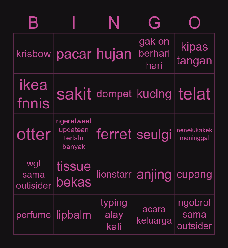 This bingo card has a free space and 24 words: tissue bekas, lipbalm, dompet, perfume, kipas tangan, krisbow, ikea fnnis, pacar, seulgi, lionstarr, kucing, otter, anjing, cupang, sakit, acara keluarga, nenek/kakek meninggal, hujan, telat, ngeretweet updatean terlalu banyak, ngobrol sama outsider, wgl sama outisider, gak on berhari hari and typing alay kali.