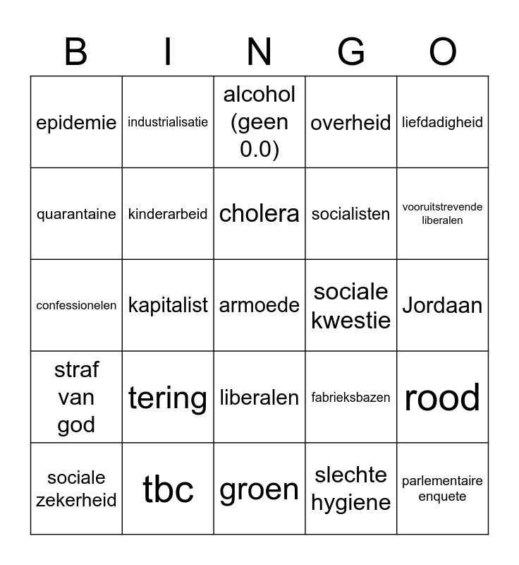 This bingo card has a free space and 24 words: tering, tbc, cholera, sociale zekerheid, liefdadigheid, epidemie, quarantaine, industrialisatie, sociale kwestie, liberalen, socialisten, confessionelen, fabrieksbazen, rood, kinderarbeid, slechte hygiene, Jordaan, alcohol (geen 0.0), vooruitstrevende liberalen, kapitalist, parlementaire enquete, straf van god, overheid and groen.