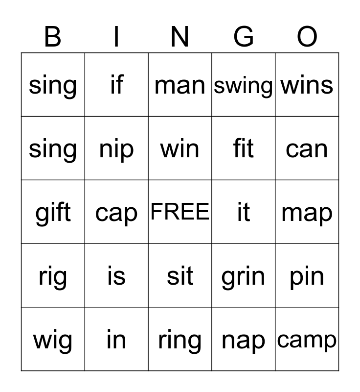 This bingo card has a free space and 24 words: is, in, win, wig, wins, sing, sing, if, it, sit, fit, gift, grin, pin, nip, nap, map, man, can, cap, camp, rig, swing and ring.