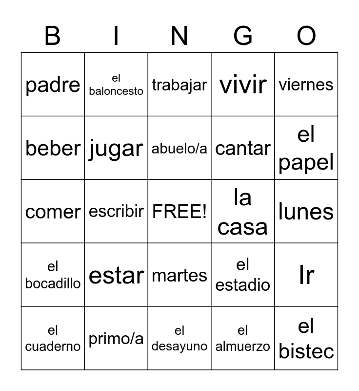 This bingo card has a free space and 59 words: gato/a, primo/a, el fútbol, hermano/a, Ir, veinte, jugar, el supermercado, la casa, la hija, beber, abrir, cantar, tener, correr, el baloncesto, abuelo/a, vivir, bailar, comer, escribir, trabajar, sábado, lunes, miercoles, domingo, martes, jueves, viernes, la camiseta, el pollo, los calcetines, la merienda, el pantalón, padre, madre, tío/a, el estadio, escuela, el bocadillo, la lechuga, el desayuno, el almuerzo, la cena, el libro, el lápiz, la pluma, la biblioteca, el papel, el cuaderno, la limonada, la mochila, las papas fritas, el bistec, ser, estar, dar, los huevos and el jugador.