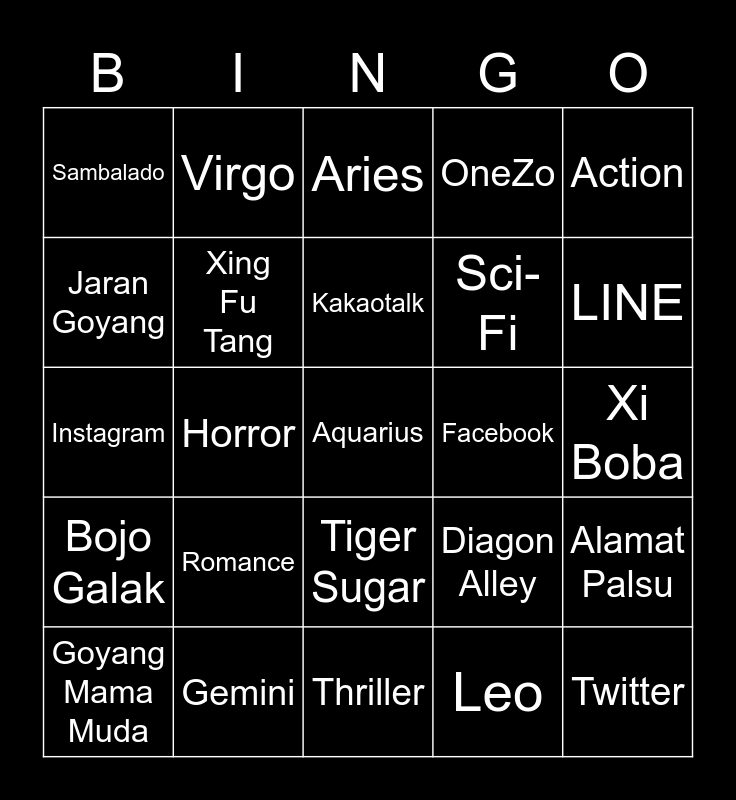 This bingo card has a free space and 24 words: Romance, Gemini, Kakaotalk, Goyang Mama Muda, Action, Sambalado, Jaran Goyang, Virgo, Facebook, Tiger Sugar, Sci-Fi, Instagram, Diagon Alley, Alamat Palsu, Xing Fu Tang, Leo, Xi Boba, Aries, LINE, Horror, Twitter, Bojo Galak, OneZo and Thriller.