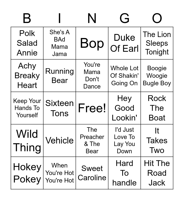 This bingo card has a free space and 55 words: Rocky Top, Hokey Pokey, Runaround Sue, Polk Salad Annie, Sweet Caroline, Kansas City, Running Bear, Hawaii Five-O, Whole Lot Of Shakin' Going On, The Stripper, Duke Of Earl, Big Spender, Wooly Bully, Mony Mony, Secret Agent Man, The Letter, The Lion Sleeps Tonight, Sixteen Tons, The Locomotion, Hit The Road Jack, Hey Good Lookin', You Never Even Called Me By My Name, I'd Just Love To Lay You Down, Bop, Watermelon Crawl, You're Mama Don't Dance, Hard To handle, Bohemian Rhapsody, Rock The Boat, It Takes Two, Bad Case Of Lovin' You (Doctor Doctor), Mission Impossible Theme, Morning Train (Nine To Five), Bad Girls, Achy Breaky Heart, Keep Your Hands To Yourself, Birn In The USA, Wild Thing, Shout, Puttin' On The Ritz, She's A BAd Mama Jama, Couple Days Off, Sara Smile, ABC, Vehicle, When You're Hot You're Hot, Bang A Gong Get It On, Stuck In The Middle With You, Dueling banjos, Boogie Woogie Bugle Boy, Dancing Machine, Smokin' In The Boys Room, Fever, The Preacher & The Bear and Feeling Good.
