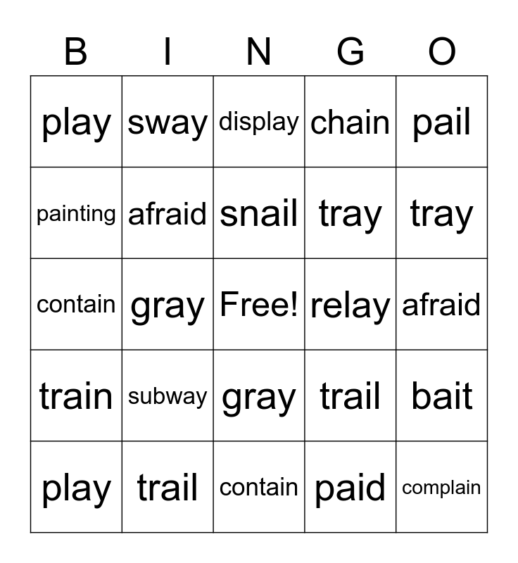 ⚠ This card has duplicate items: complain (2), birthday (2), contain (2), subway (2), stray (2), sway (2), display (2), painting (2), today (2), afraid (2), chain (2), bait (2), trail (2), mail (2), rain (2), snail (2), relay (2), train (3), pail (2), gray (2), paid (2), play (2), tray (2)