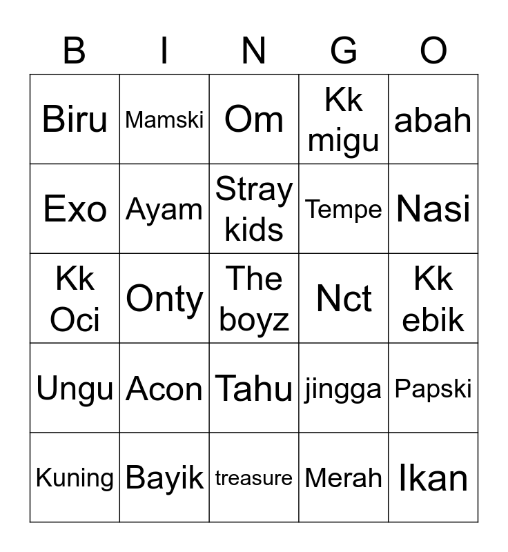 This bingo card has a free space and 24 words: Acon, Bayik, Stray kids, Kuning, abah, Biru, Exo, Mamski, Nct, Tahu, Tempe, Kk Oci, jingga, Papski, Ayam, Merah, Kk ebik, Om, Nasi, Onty, Ikan, Ungu, Kk migu and treasure.