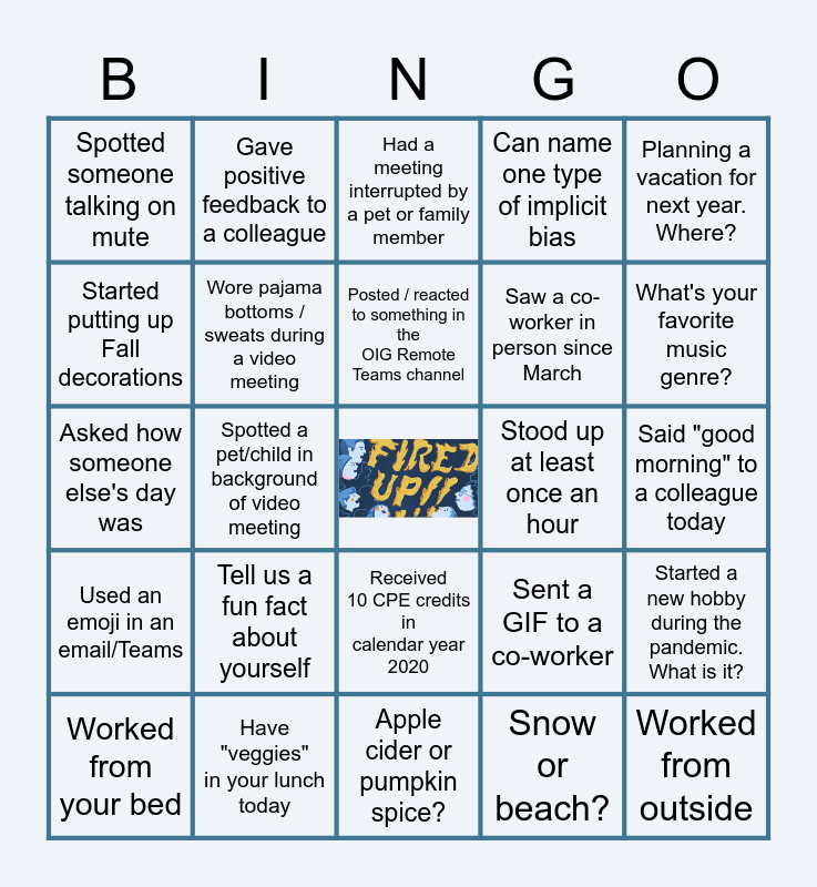 This bingo card has a free space and 24 words: Tell us a fun fact about yourself, Have "veggies" in your lunch today, Posted / reacted to something in the OIG Remote Teams channel, Worked from your bed, Planning a vacation for next year. Where?, Spotted someone talking on mute, Started putting up Fall decorations, Gave positive feedback to a colleague, Stood up at least once an hour, Received 10 CPE credits in calendar year 2020, Saw a co-worker in person since March, Asked how someone else's day was, Sent a GIF to a co-worker, Started a new hobby during the pandemic. What is it?, Wore pajama bottoms / sweats during a video meeting, Snow or beach?, Said "good morning" to a colleague today, Had a meeting interrupted by a pet or family member, What's your favorite music genre?, Spotted a pet/child in background of video meeting, Worked from outside, Used an emoji in an email/Teams, Can name one type of implicit bias and Apple cider or pumpkin spice?.