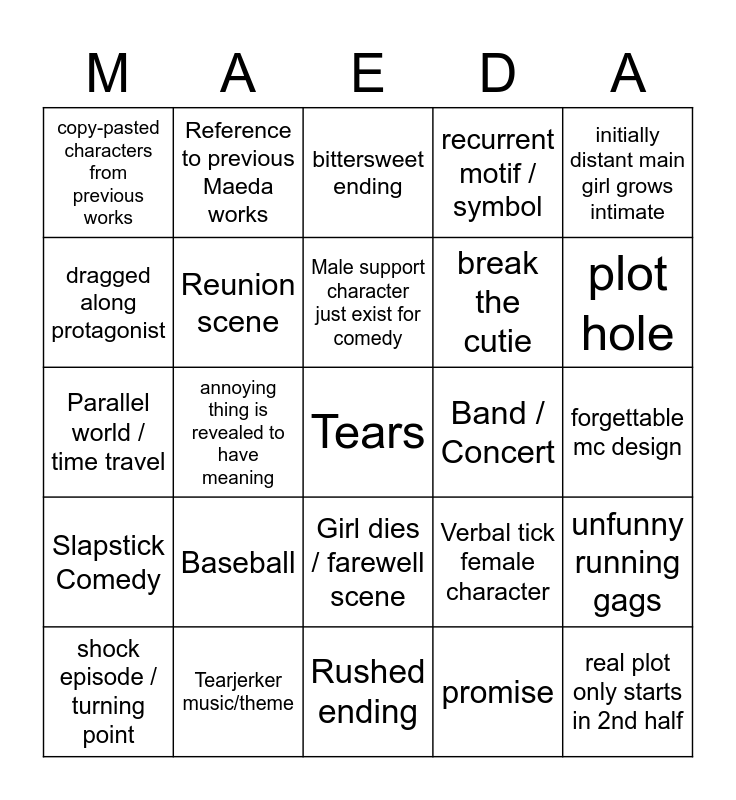 This bingo card has a free space and 24 words: Baseball, Tearjerker music/theme, Male support character just exist for comedy, shock episode / turning point, initially distant main girl grows intimate, copy-pasted characters from previous works, dragged along protagonist, Reference to previous Maeda works, Band / Concert, Girl dies / farewell scene, break the cutie, Parallel world / time travel, Verbal tick female character, unfunny running gags, Reunion scene, promise, forgettable mc design, bittersweet ending, plot hole, annoying thing is revealed to have meaning, real plot only starts in 2nd half, Slapstick Comedy, recurrent motif / symbol and Rushed ending.