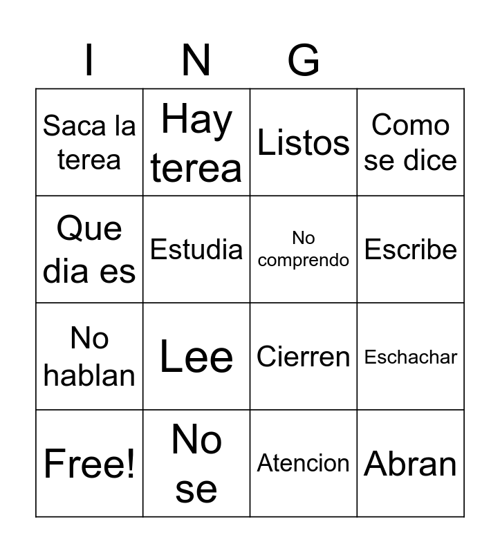 This bingo card has 16 words: No se, Eschachar, Listos, Saca la terea, No hablan, Hay terea, Cierren, Atencion, Que dia es, Estudia, Free!, Como se dice, Lee, Escribe, No comprendo and Abran.